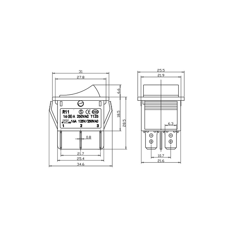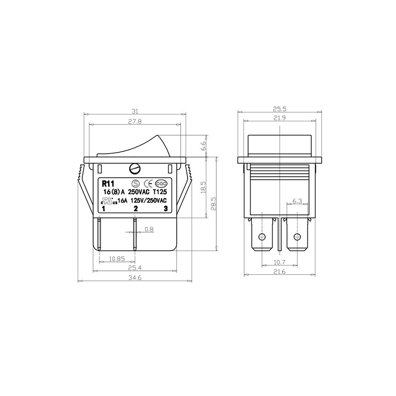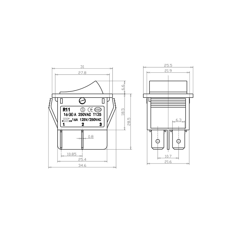 Шанхайская компания Qijia Electronics Co., Ltd. Дом / Продукция / Рокерный переключатель / Рокерный переключатель R11 / R11-22 Трехпозиционный коромысловый переключатель