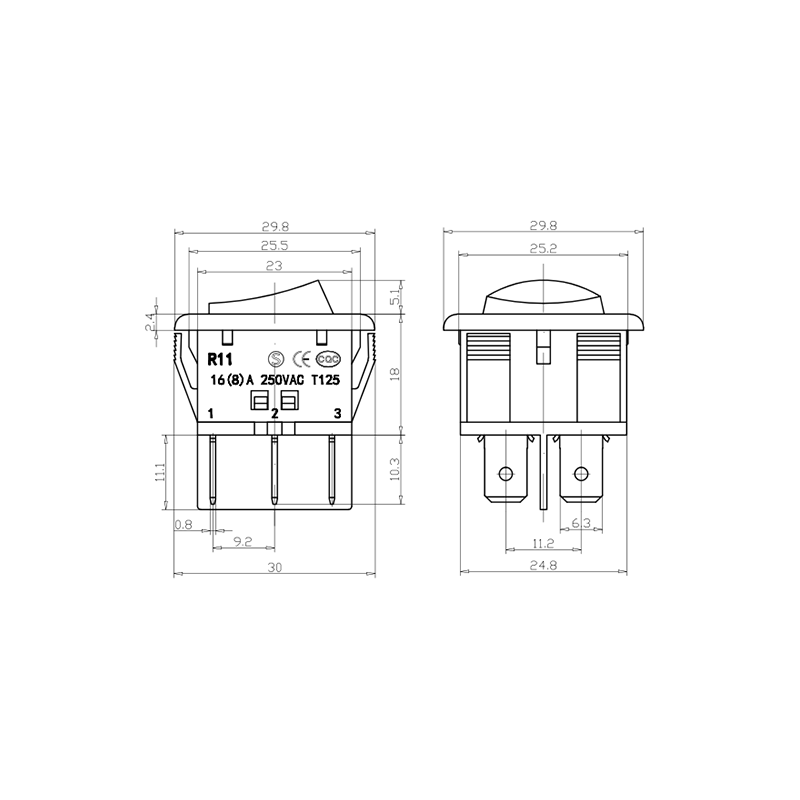 Шанхайская компания Qijia Electronics Co., Ltd. Дом / Продукция / Рокерный переключатель / Рокерный переключатель R11 / R11-32 Круглый кнопочный коромысловый переключатель