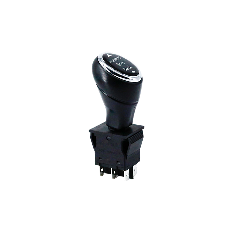 По внешнему дизайну переключатель серии R11-68 имеет компактную и элегантную конструкцию из черного пластика — материал гарантирует как долговечность, так и удобное захват ручки при эксплуатации. Ручка выполнена в цилиндрической форме с гладкой поверхностью: это обеспечивает простоту управления и минимизирует риск случайных ошибок при переключении. В верхней части ручки расположены прозрачные маркировки, обозначающие различные рабочие положения: «Вперед», «Стоп» и «Назад». Данные маркировки позволяют пользователям быстро определять текущий режим и осуществлять оперативное переключение между позициями.